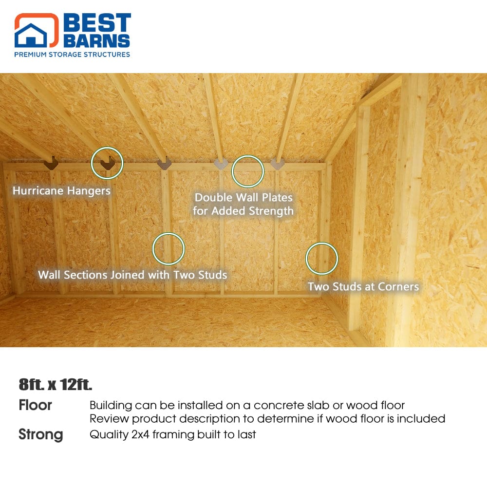 • Outside Measurements: 8'W x 12'D x 8'H (not including floor if added)