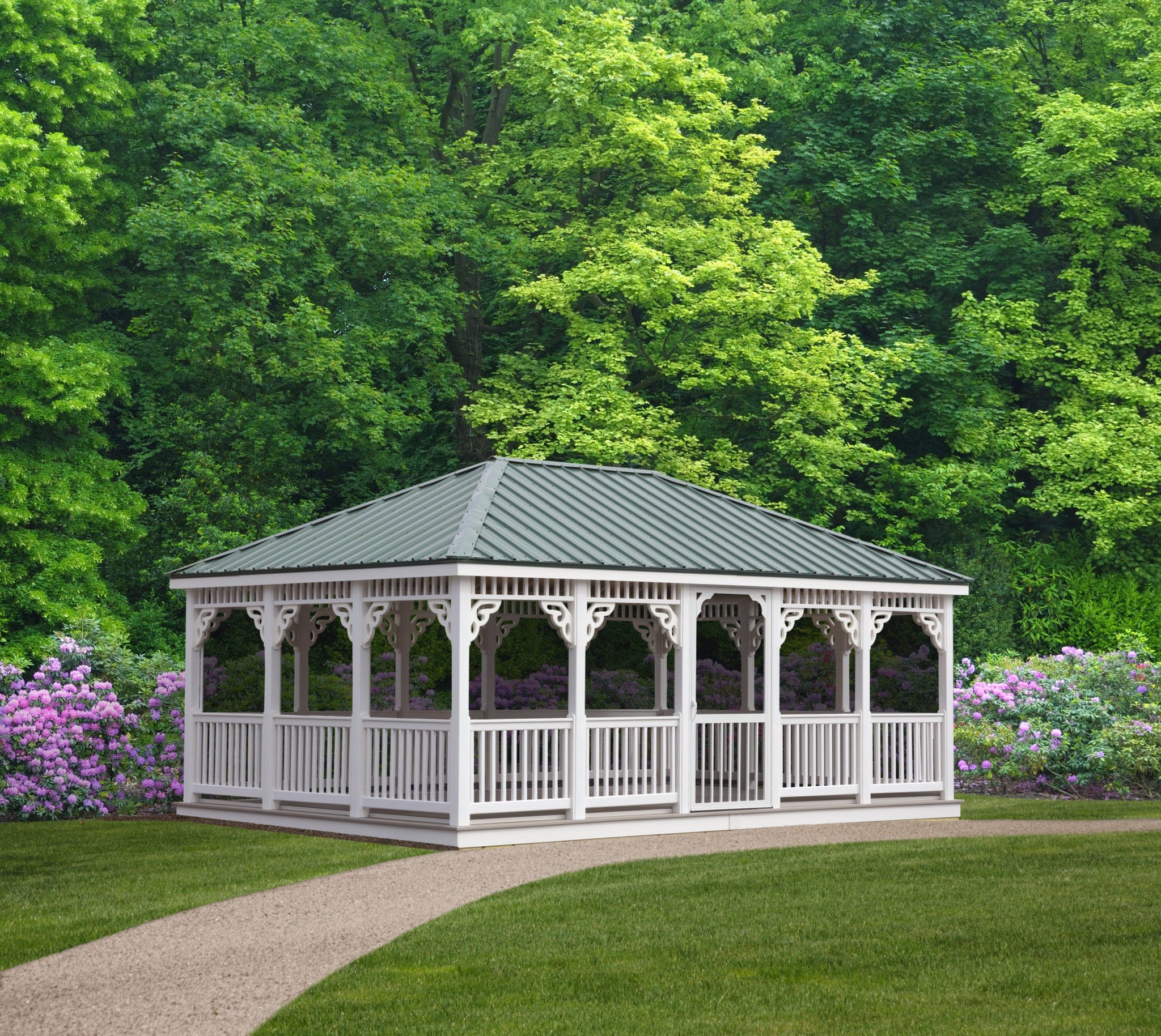 Gazebos are usually free-standing. Many gazebos include a built-in floor or we can place it on a concrete base. However, the most telling feature of a gazebo is its shape. Most are octagon or oval-shaped, but we also offer rectangular designs. It all depends on what your needs are. Outdoor Sheds would like to help you find what you are looking for.